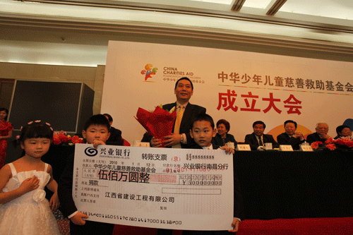 中華少年兒童慈善救助基金會(以下簡稱“兒慈會”)2010年1月12日在北京人民大會堂正式成立。中共中央政治局常委、國務院副總理李克強在為基金會成立發來的賀信中說:“慈善救助是一項崇高的事業,是對社會保障的重要補充。謹對基金會的成立表示祝賀,對大家矢志從事少年兒童事業表示由衷的敬意。希望并相信你們會在各方支持下,發揮優勢,搭建平臺,幫助更多有特殊困難的少年兒童和他們的同齡人,一起在同一片藍天下健康成長。”江西省建設工程有限公司董事長宗贛生到會并捐贈人民幣500萬元設立"自立奮進獎",宗贛生表示,以后會根據企業發展狀況捐款額逐年遞增,對貧困學生以及教師進行資助和獎勵。