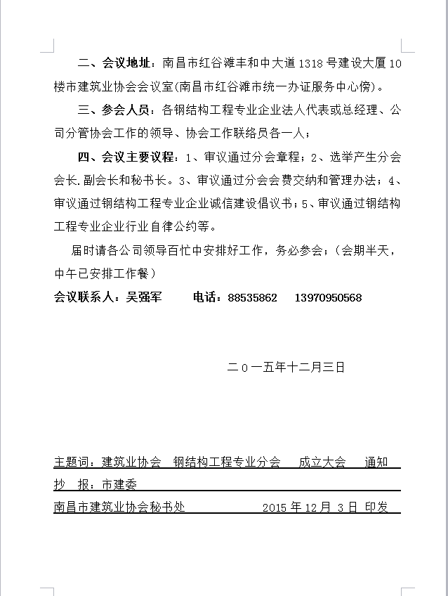 關于召開南昌市建筑業協會鋼結構工程專業分會成立大會的通知
